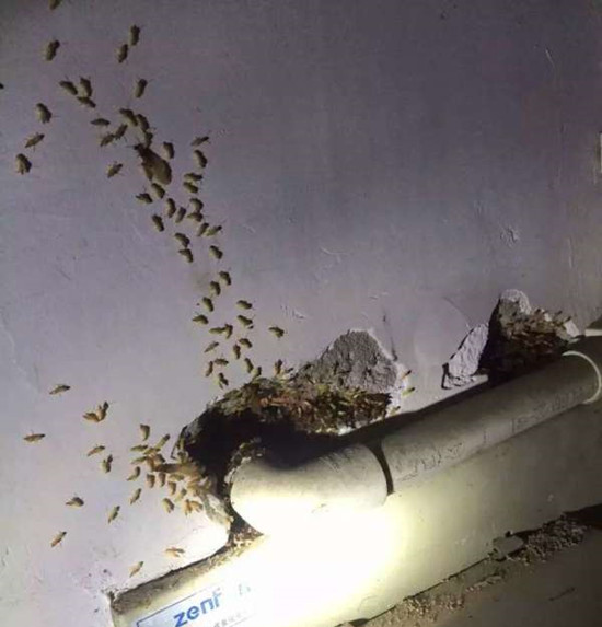 它從這里出來,噴了以后過了兩天,它又改道了,后來地下又爬一片,你看這門都鏤空了。
